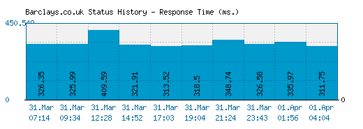 The above graph displays service status activity for Barclays.co.uk over the last 10 automatic checks. The blue bar displays the response time, which is better when smaller. If no bar is displayed for a specific time it means that the service was down and the site was offline.