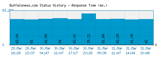 The above graph displays service status activity for Buffalonews.com over the last 10 automatic checks. The blue bar displays the response time, which is better when smaller. If no bar is displayed for a specific time it means that the service was down and the site was offline.