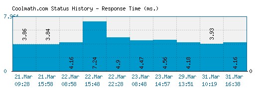 The above graph displays service status activity for Coolmath.com over the last 10 automatic checks. The blue bar displays the response time, which is better when smaller. If no bar is displayed for a specific time it means that the service was down and the site was offline.