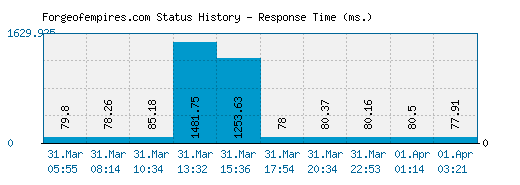 The above graph displays service status activity for Forgeofempires.com over the last 10 automatic checks. The blue bar displays the response time, which is better when smaller. If no bar is displayed for a specific time it means that the service was down and the site was offline.
