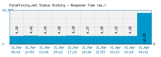 The above graph displays service status activity for Furaffinity.net over the last 10 automatic checks. The blue bar displays the response time, which is better when smaller. If no bar is displayed for a specific time it means that the service was down and the site was offline.