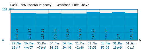 The above graph displays service status activity for Gandi.net over the last 10 automatic checks. The blue bar displays the response time, which is better when smaller. If no bar is displayed for a specific time it means that the service was down and the site was offline.