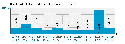 The above graph displays service status activity for Gazeta.pl over the last 10 automatic checks. The blue bar displays the response time, which is better when smaller. If no bar is displayed for a specific time it means that the service was down and the site was offline.