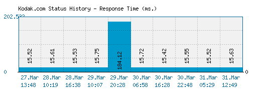 The above graph displays service status activity for Kodak.com over the last 10 automatic checks. The blue bar displays the response time, which is better when smaller. If no bar is displayed for a specific time it means that the service was down and the site was offline.