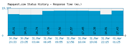 The above graph displays service status activity for Mapquest.com over the last 10 automatic checks. The blue bar displays the response time, which is better when smaller. If no bar is displayed for a specific time it means that the service was down and the site was offline.