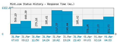 The above graph displays service status activity for Mint.com over the last 10 automatic checks. The blue bar displays the response time, which is better when smaller. If no bar is displayed for a specific time it means that the service was down and the site was offline.