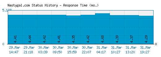 The above graph displays service status activity for Nastygal.com over the last 10 automatic checks. The blue bar displays the response time, which is better when smaller. If no bar is displayed for a specific time it means that the service was down and the site was offline.