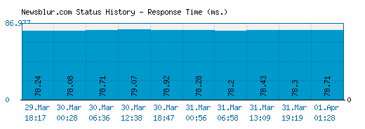The above graph displays service status activity for Newsblur.com over the last 10 automatic checks. The blue bar displays the response time, which is better when smaller. If no bar is displayed for a specific time it means that the service was down and the site was offline.