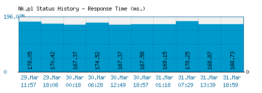 The above graph displays service status activity for Nk.pl over the last 10 automatic checks. The blue bar displays the response time, which is better when smaller. If no bar is displayed for a specific time it means that the service was down and the site was offline.