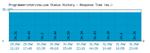 The above graph displays service status activity for Programmerinterview.com over the last 10 automatic checks. The blue bar displays the response time, which is better when smaller. If no bar is displayed for a specific time it means that the service was down and the site was offline.
