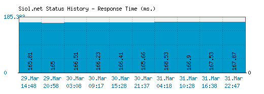 The above graph displays service status activity for Siol.net over the last 10 automatic checks. The blue bar displays the response time, which is better when smaller. If no bar is displayed for a specific time it means that the service was down and the site was offline.