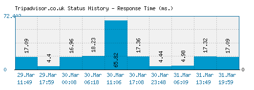 The above graph displays service status activity for Tripadvisor.co.uk over the last 10 automatic checks. The blue bar displays the response time, which is better when smaller. If no bar is displayed for a specific time it means that the service was down and the site was offline.