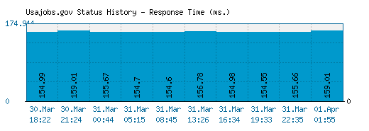 The above graph displays service status activity for Usajobs.gov over the last 10 automatic checks. The blue bar displays the response time, which is better when smaller. If no bar is displayed for a specific time it means that the service was down and the site was offline.