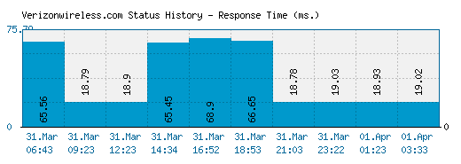 The above graph displays service status activity for Verizonwireless.com over the last 10 automatic checks. The blue bar displays the response time, which is better when smaller. If no bar is displayed for a specific time it means that the service was down and the site was offline.