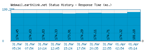The above graph displays service status activity for Webmail.earthlink.net over the last 10 automatic checks. The blue bar displays the response time, which is better when smaller. If no bar is displayed for a specific time it means that the service was down and the site was offline.