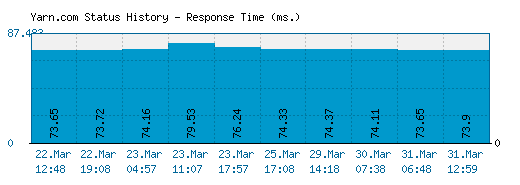 The above graph displays service status activity for Yarn.com over the last 10 automatic checks. The blue bar displays the response time, which is better when smaller. If no bar is displayed for a specific time it means that the service was down and the site was offline.
